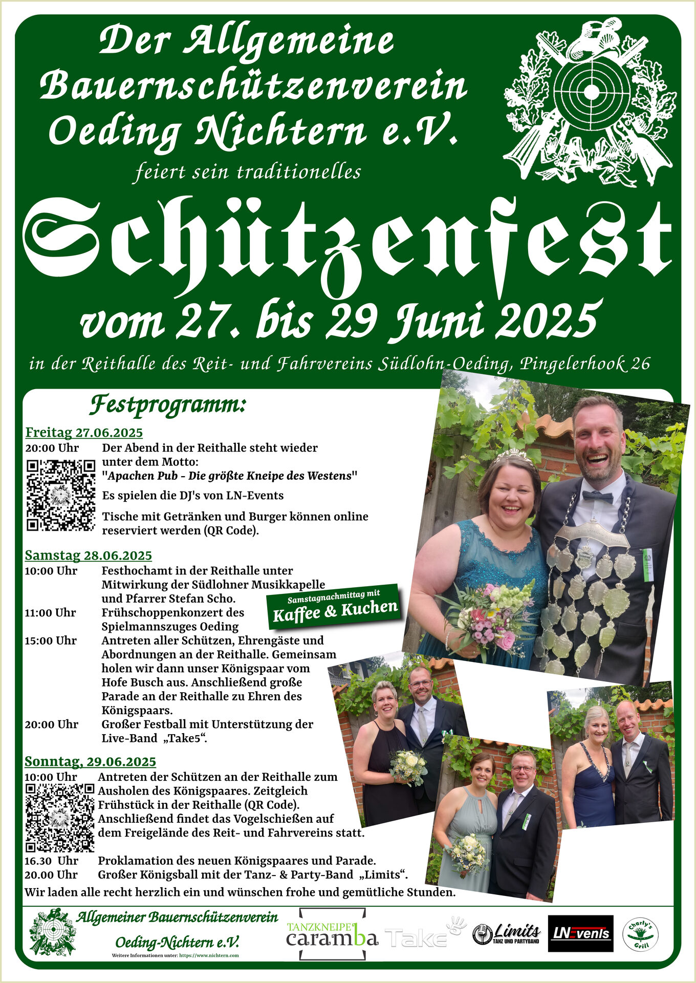 Wir starten das Schützenfest am Freitag den 27.Juni mit DJ und Live-Musik für die Jugend. Dem amtierenden Thron gehört der Samstag, den 28 Juni, bevor wir dann am Sonntag, den 29. Juni in der Reithalle des Reit – und Fahrvereins Südlohn-Oeding mit dem Vogelschießen zum Höhepunkt kommen.
